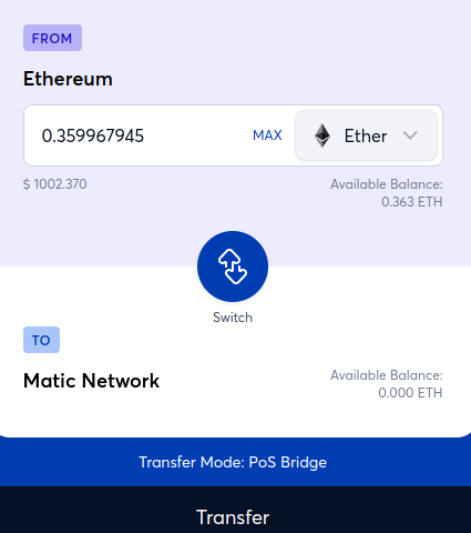 From there, open the Matic Network wallet and transfer the ETH to the Polygon / Matic network